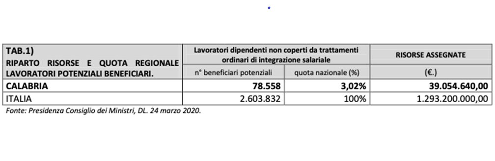 CATANZARO «Uno dei riflessi più evidenti e pericolosi dell’epidemia da Coronavirus è quello sul mondo del lavoro. Soprattutto in Calabria, se non si assumono decisioni anticicliche, l’economia subirà un pesante ridimensionamento in ogni suoi settore». Lo sostiene dal segreteria regionale della Uil Calabria che ha analizzato i riflessi del decreto “Cura Italia” relativamente alla regione Calabria comparando le misure previste e destinate a tutto il territorio. «Per limitare l’impatto dell’emergenza sanitaria sul mercato del lavoro il Consiglio dei ministri ha pubblicato in Gazzetta ufficiale, il 17 marzo 2020, il Decreto legge n. 18, “Misure di potenziamento del Servizio sanitario nazionale e di sostegno economico per famiglie, lavoratori e imprese connesse all’emergenza epidemiologica da Covid-19”. Il decreto interviene con provvedimenti su quattro fronti principali e altre misure settoriali: finanziamento e altre misure per il potenziamento del Sistema sanitario nazionale, della Protezione civile e degli altri soggetti pubblici impegnati sul fronte dell’emergenza; sostegno all’occupazione e ai lavoratori per la difesa del lavoro e del reddito; supporto al credito per famiglie e micro, piccole e medie imprese, tramite il sistema bancario e l’utilizzo del fondo centrale di garanzia e sospensione degli obblighi di versamento per tributi e contributi nonché di altri adempimenti fiscali ed incentivi fiscali per la sanificazione dei luoghi di lavoro e premi ai dipendenti che restano in servizio. Tra le misure di sostegno all’occupazione e ai lavoratori per la difesa del lavoro e del reddito, sono comprese i vari strumenti per contrastare gli effetti della emergenza sanitaria sul mercato del lavoro, con la possibilità di ricorrere alla Cassa Integrazione Guadagni in Deroga in favore dei datori di lavoro privati. In questo quadro il Governo ha emanato le norme di riparto tra le regioni di questo ammortizzatore sociale, assegnando alla Calabria una quota pari al 3,02% delle risorse nazionali. La tabella 1 ci rende chiaro il “peso” economico di questo intervento per l’economia calabrese rispetto a quella nazionale».