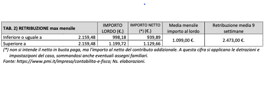 «Dato che il beneficio in deroga può essere percepito, per ogni lavoratore, per un massimo di 9 settimane, al fine di valutare la distribuzione possibile dei benefici, alla platea potenziale dei lavoratori, si prenderà a base di calcolo, il livello di retribuzione media delle 9 settimane, pari a 2.473,00 euro (tabella 2). Si ricordi, anche che: Il trattamento ordinario di integrazione salariale (D.Lgs. 148/2015) è pari all’80%della retribuzione che sarebbe spettata al lavoratore per le ore di lavoro non prestate. Il trattamento integra o sostituisce la retribuzione dei lavoratori a cui è stata sospesa o ridotta l’attività lavorativa per situazioni aziendali dovute a eventi transitori e non imputabili all’impresa o ai dipendenti, incluse le intemperie stagionali e per situazioni temporanee di mercato».