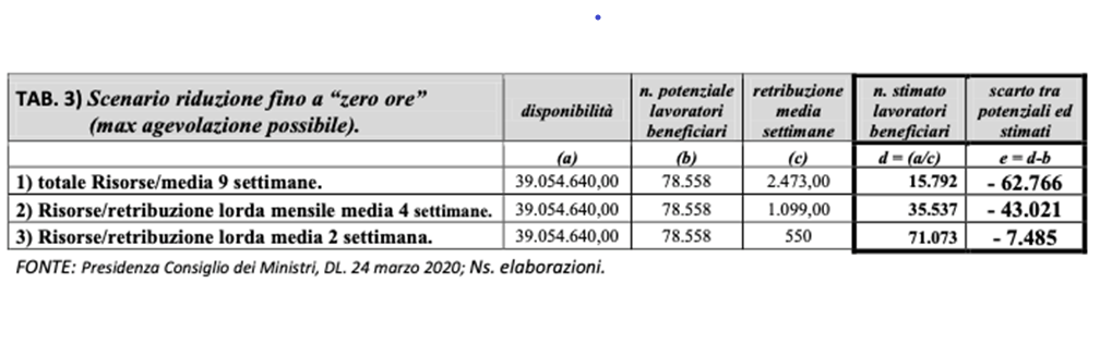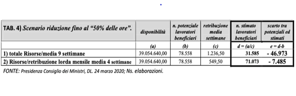 Considerando l’insieme di questi elementi, sopra riportati: platea dei lavoratori potenzialmente beneficiari: n. 78.558 unità; dotazione finanziaria assegnata alla Calabria: 39.054.640,00 €.; retribuzione media delle 9 settimane: 2.473,00 €.; dal punto di vista dell’impatto quantitativo, si potranno verificare diversi scenari, per ognuna delle condizioni di accesso che le imprese intenderanno adottare, relativamente alla riduzione del numero di ore: