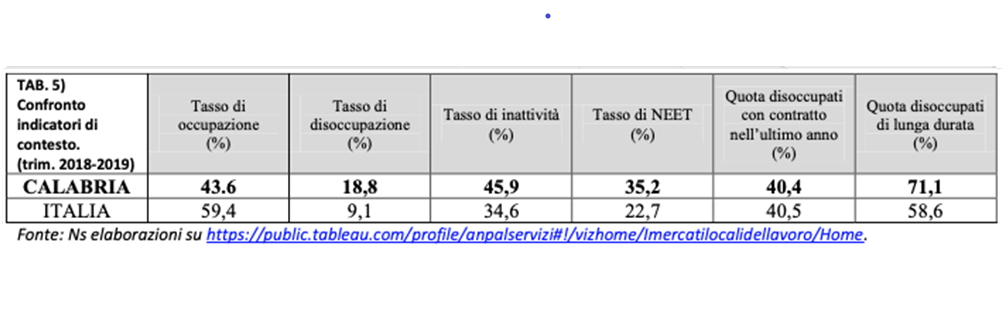Tutti gli indicatori esprimono una notevole distanza della Calabria dai livelli nazionali; di particolare rilevanza il tasso di disoccupazione, che registra valori pari a più del doppio di quello nazionale, oltre alla disoccupazione di lunga durata che registra una distanza del valore regionale, rispetto a quello nazionale pari al 12,5 %. Sulla base dei dati analizzati, scaturiscono diversi ordini di considerazioni: l’impatto negativo stimato dal Decreto legge 18/2020, pari a 78.558 lavoratori (Tab. 1) rischia, con l’attuale disponibilità di risorse assegnate alla Regione, di non poter garantire il totale delle richieste di accesso agli ammortizzatori sociali in deroga previsti (Tabb. 3 e 4); un considerevole bacino di lavoratori, particolarmente esposti agli effetti della crisi e a rischio di