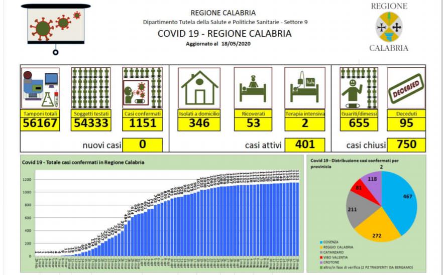 CATANZARO In Calabria ad oggi sono stati effettuati 54.333 tamponi. Le persone risultate positive al Coronavirus sono 1.151 (+0 rispetto a ieri), quelle negative sono 53.182.