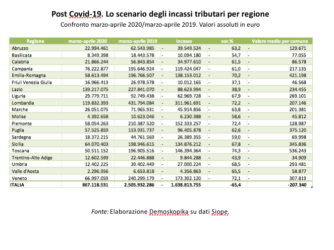 Scenario regionale: Toscana, Emilia-Romagna e Puglia sul podio dei Comuni “più sofferenti”. Ognuno dei quasi 8 mila comuni italiani ha subìto una contrazione media delle entrate tributarie pari a poco più di 207 mila euro. Spostando l’osservazione sul livello regionale emerge un quadro abbastanza differenziato. In particolare, sul podio delle casse più “prosciugate” si posizionano i Comuni di tre realtà regionali: Toscana, Emilia-Romagna e Puglia. In particolare, in Toscana, i Comuni registrano una flessione degli incassi pari mediamente a 536 mila euro per ente locale (-74,3%) quantificabile in oltre 146 milioni di euro immediatamente seguito dall’Emilia-Romagna, i cui Comuni hanno registrato mancati incassi per 421 mila euro (-70,2%) pari a 138 milioni di euro in valore assoluto. A chiudere questo primo raggruppamento, gli enti locali della Puglia, le cui mancate risorse finanziarie ammontano mediamente a 375 mila euro per Comune (-62,6%) pari a 96 milioni di euro in valore assoluto. Sul versante opposto, ad aver subìto minori contraccolpi negli ultimi due mesi dell’anno in corso, risultano i Comuni del Trentino-Alto Adige con una flessione degli incassi tributari pari mediamente a poco meno di 35 mila euro per ente locale (-43,9%) quantificabile in quasi 10 milioni di euro. A seguire gli enti locali del Molise con una riduzione media per Comune di quasi 46 mila euro (-58,6%) pari a oltre 6 milioni di euro e del Friuli Venezia Giulia le cui mancate risorse finanziarie ammontano mediamente a quasi 47 mila euro per Comune (-37,1%) pari a oltre 10 milioni di euro in valore assoluto.