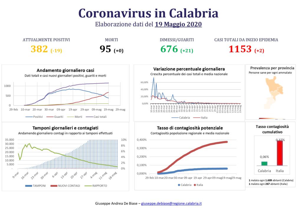 – Reggio Calabria: 5 in reparto; 1 in rianimazione; 68 in isolamento domiciliare; 182 guariti; 17 deceduti.