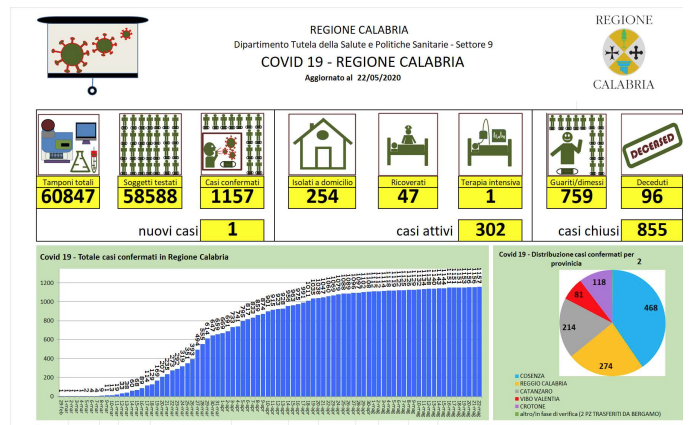 Covid-19, in Calabria soltanto un caso in più. Sono 759 i guariti – GRAFICI