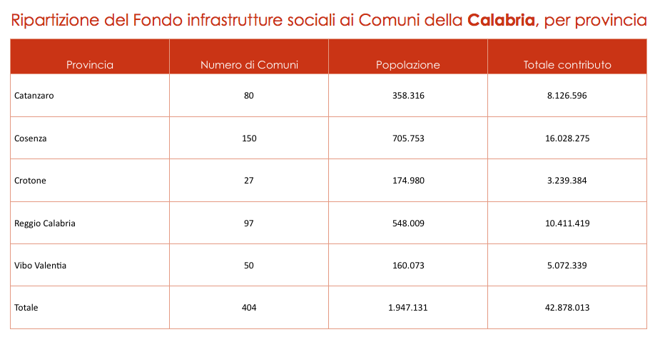 ROMA Sbloccati i trecento milioni di euro del Fondo infrastrutture sociali per i Comuni del Sud. Con la presa d’atto della Conferenza Stato-Città, dopo un confronto essenziale con l’Anci, è arrivato oggi il via libera al decreto che ripartisce 75 milioni annui, dal 2020 al 2023, direttamente alle amministrazioni locali del Mezzogiorno, privilegiando le città medie e piccole, per nuovi interventi, manutenzioni straordinarie, su scuole, strutture e residenze sanitarie, edilizia sociale, beni culturali, impianti sportivi, arredo urbano, verde pubblico, e altri ambiti della vita sociale. Il totale del contributo per la Calabria è di 42,8 milioni di euro. Questa la suddivisione per province: a Catanzaro 8,1 milioni, Cosenza 16 milioni, Crotone 3,2 milioni, Reggio Calabria 10,4 milioni e Vibo Valentia 5 milioni.