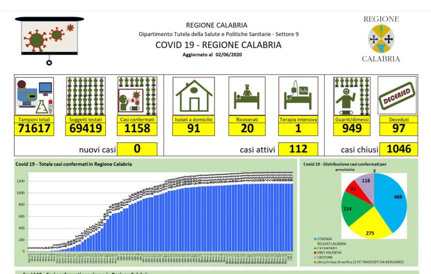 – Cosenza: 2 in reparto; 67 in isolamento domiciliare; 365 guariti; 34 deceduti.
