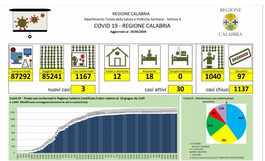 È stata esclusa definitivamente la positività del caso di Crotone comunicato il 18 giugno, pertanto i positivi di Crotone ritornano ad essere 118.