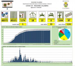 – Cosenza: 1 in reparto; 2 in isolamento domiciliare; 431 guariti; 34 deceduti.
