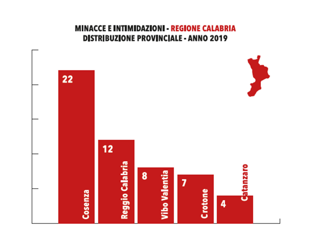 IL RAPPORTO: CALABRIA QUARTA IN ITALIA Il 61% del totale dei casi censiti (342) si è registrato nel Mezzogiorno, in particolare il 42.6% dei casi nel Sud (percentuale stabile rispetto al 2018) e il 18.6% nelle Isole (in calo). Il restante 39% del totale (217 casi censiti) si è verificato nel Centro-Nord, dove si riscontra un aumento del 5.5% delle minacce e intimidazioni rispetto al 2018. Casi in crescita al Nord, con la Lombardia che guadagna il quinto posto nella particolare classifica che vede i primi quattro posti saldamente in mano alle regioni “storiche”. La regione più colpita si conferma per il terzo anno consecutivo la Campania dove sono 92 i casi censiti. Seguono a ruota la Puglia con 71 e la Sicilia con 66. Stabile sui livelli dell’anno precedente la Calabria, al quarto posto con 53 casi.