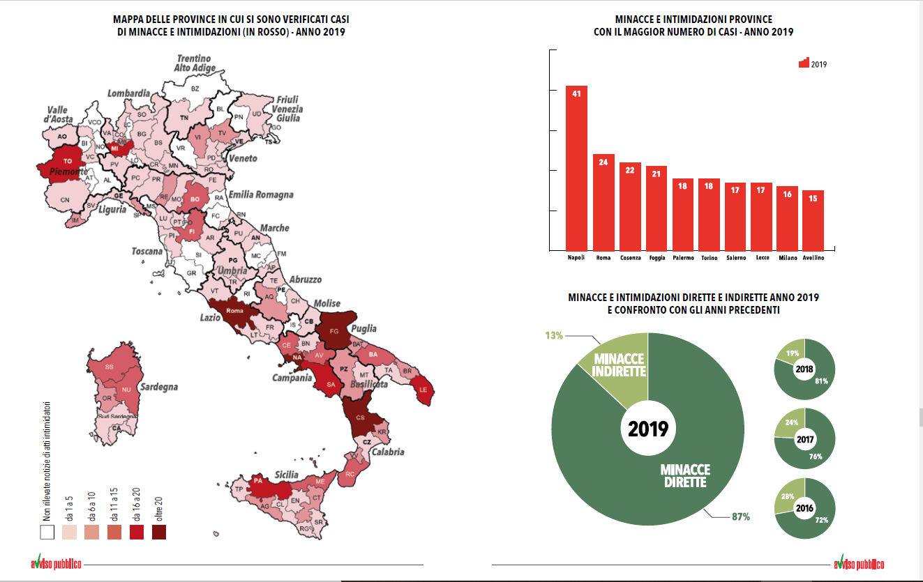 L’associazione ha censito, nell’anno 2019, 559 atti intimidatori, di minaccia e violenza nei confronti degli amministratori locali, una ogni 15 ore. Sono state 83 le Province coinvolte – oltre il 75% del territorio nazionale – e 336 i Comuni, il dato più alto mai registrato. Per la seconda volta nella storia di questo Rapporto sono stati censiti atti intimidatori in tutte le regioni d’Italia.