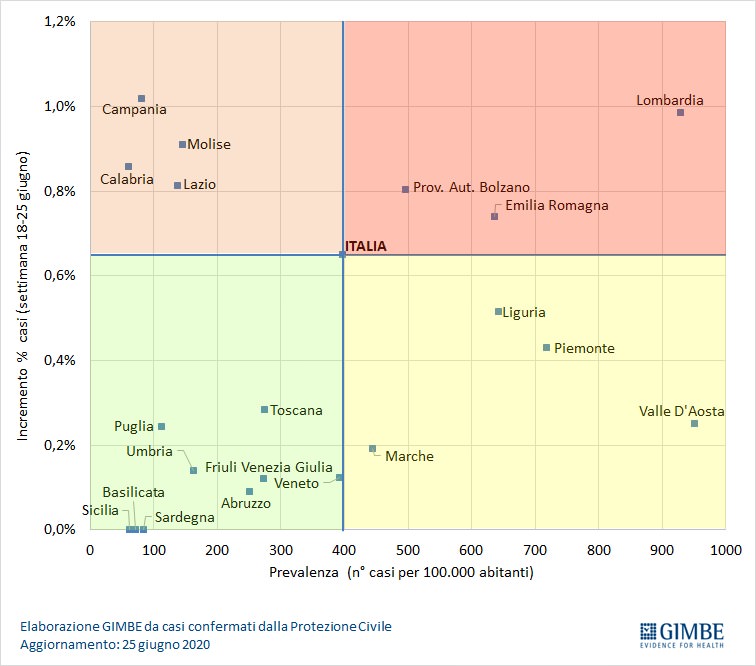 Ecco la lista delle regioni italiane e il relativo indice di contagio: Abruzzo 0,42; Basilicata 0,26; Calabria 0,43; Campania 0,21; Emilia Romagna 1,01; Friuli Venezia Giulia 0,69; Lazio 1,24; Liguria 0,76; Lombardia 1,01; Marche 0,86; Molise 0,09; Prov. autonoma di Bolzano 0,4; Piemonte 0,69; Prov. Autonoma di Trento 0,13; Puglia 0,36; Sardegna 0,27; Sicilia 0,83; Toscana 0,96; Umbria 0; Valle d’Aosta 0,18; Veneto 0,81