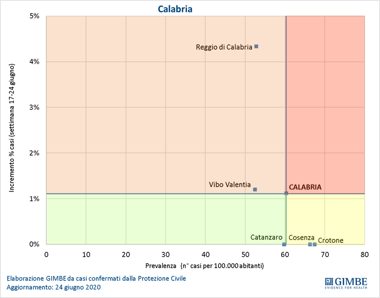 Le province calabresi rappresentate nei quadranti: come si vede, per Catanzaro, Cosenza e Crotone l’aumento dei casi è nullo. Ma i numeri – nonostante il focolaio di Palmi – sono molto bassi