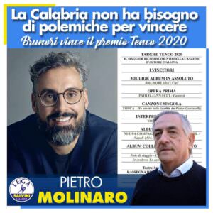 COSENZA Ci aveva provato il consigliere regionale leghista Pietro Molinaro a cavalcare l’onda del grande successo, editoriale e mediatico, del cantautore Dario Brunori, vincitore del prestigioso Premio Tenco come miglior album in assoluto. Il tonfo dell’operazione politico-piaciona, però, si è sentito in tutte le latitudini calabre, non solo nella provincia di Cosenza, patria dell’artista e pascolo di voti per Molinaro.