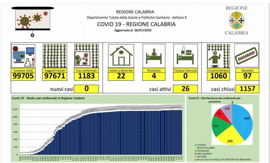 – Catanzaro: 1 in reparto; 1 in isolamento domiciliare; 182 guariti; 33 deceduti.