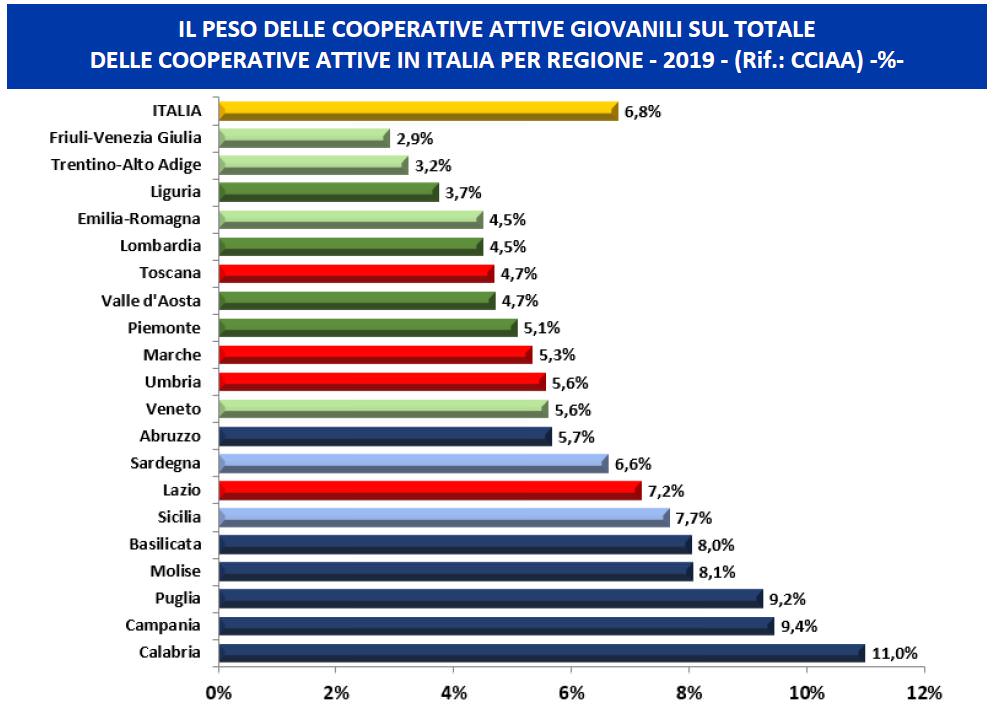 In termini di numeri assoluti a fine 2019 si contano in Italia 5.347 cooperative di giovani che in termini percentuali rappresentano il 6,8% del totale della cooperative registrate come attive presso le Camere di Commercio del Paese.