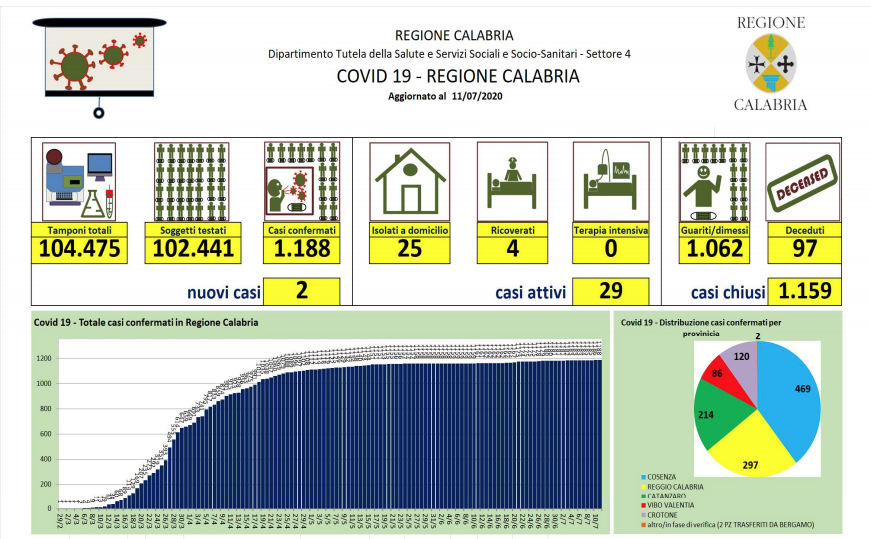 – Catanzaro: 1 in reparto; 183 guariti; 33 deceduti.