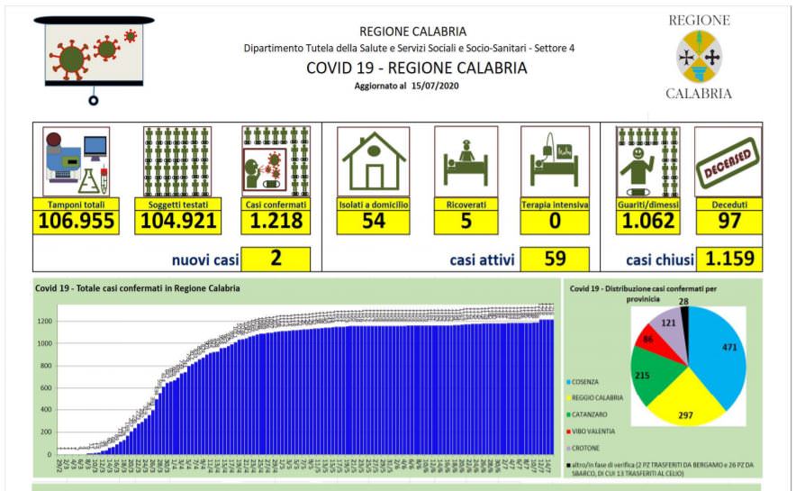 Nel conteggio sono compresi anche i due pazienti di Bergamo trasferiti a Catanzaro, mentre non sono compresi i numeri del contagio pervenuti dopo la comunicazione dei dati alla Protezione Civile Nazionale.