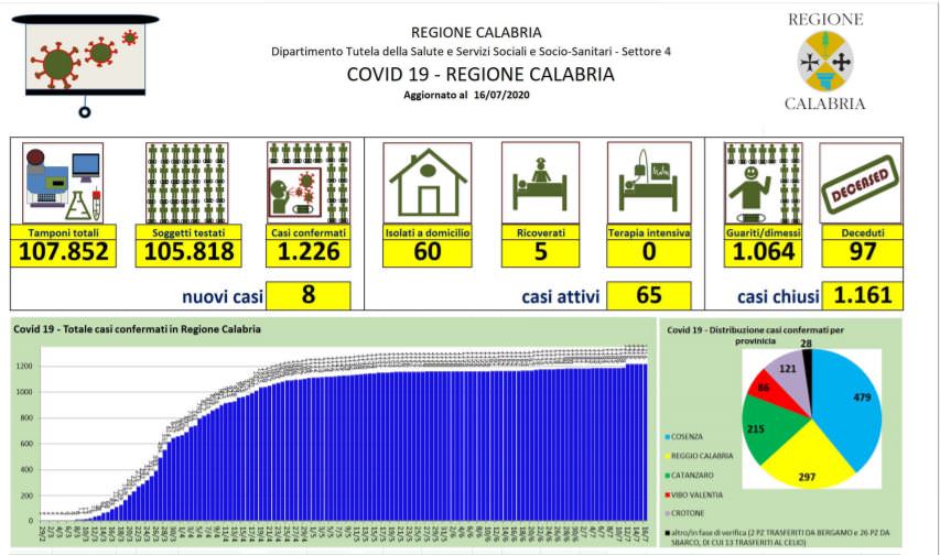 – Catanzaro: 1 in reparto; 1 in isolamento domiciliare; 183 guariti; 33 deceduti.