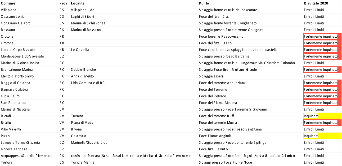 In Calabria sono stati 6 i punti monitorati in provincia di Cosenza, tutti risultati entro i limiti di legge. Si tratta del punto sulla spiaggia di fronte al canale del pescatore a Villapiana Lido; del punto sulla foce del Crati in località Laghi di Sibari, nel Comune di Cassano Jonio; del punto sulla spiaggia di fronte al torrente Coriglianeto in località Marina di Schiavonea a Corigliano Calabro; di un punto sulla spiaggia di fronte la foce del torrente Colognati a Marina di Rossano; di un punto sempre sulla spiaggia presso la foce del fiume Bagni, al confine tra i territori comunali di Acquappesa e Guardia Piemontese e infine su un punto sulla spiaggia presso la foce del Noce a Tortora Marina.