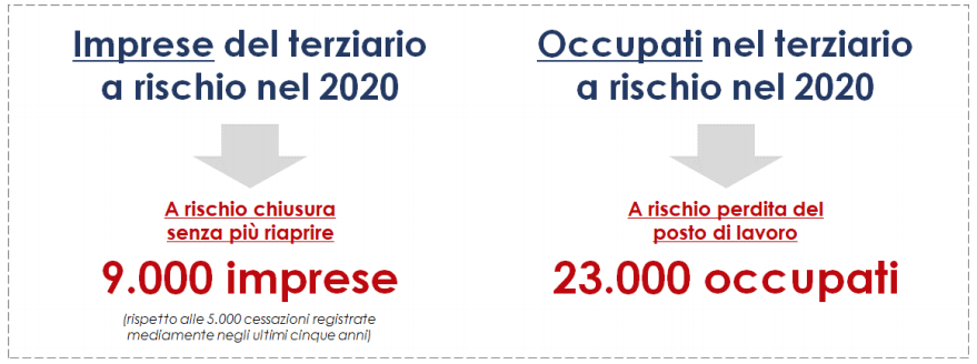 IMPATTO DEL LOCKDOWN In Italia esistono 4,5 milioni di imprese extra agricole. In Calabria, la quota di imprese registrate al 30 giugno 2020 era pari a quasi 130 mila unità, di cui oltre un terzo operative nella provincia di Cosenza. Le imprese del terziario (commercio, turismo, servizi) della Calabria sono oltre 94 mila, costituendo il 73% dell’intero tessuto imprenditoriale extra agricolo del territorio. A seguito dell’esplosione dei contagi, il Governo centrale ha imposto un lockdown che ha interessato larga parte del tessuto produttivo. La sospensione delle attività ha comportato la paralisi del tessuto produttivo in Calabria e per queste ragioni il terziario rischia di perdere nel 2020 circa 2 miliardi di valore aggiunto. Allo stesso modo, gli effetti potrebbero essere devastanti anche sul tessuto delle imprese: 9.000 imprese del terziario rischiano di chiudere senza più riaprire, con conseguenze dirette sui livelli occupazionali (23.000 lavoratori rischiano il posto). La pandemia ha causato anche una forte riduzione degli investimenti previsti nei prossimi due anni: sul 45% di imprese che avevano in programma di effettuarli, il 52% dovrà rinunciare a causa della crisi dovuta al Covid-19.