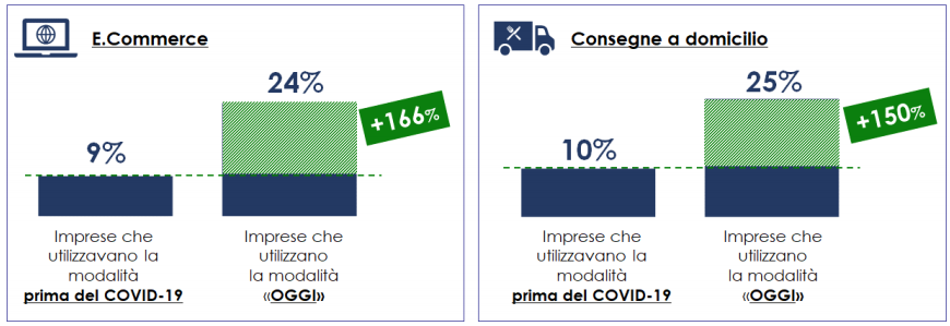 ORGANIZZAZIONE AZIENDALE L’emergenza sanitaria ha avuto un forte impatto sulle nuove modalità di erogazione dei servizi: ad oggi, il 24% delle imprese è presente sui canali e-commerce e il 25% effettua consegne a domicilio. Il 45% delle imprese della Calabria continuerà ad utilizzare il canale e-commerce anche ad emergenza terminata. Il 54% delle imprese continuerà ad effettuare le consegne a domicilio.