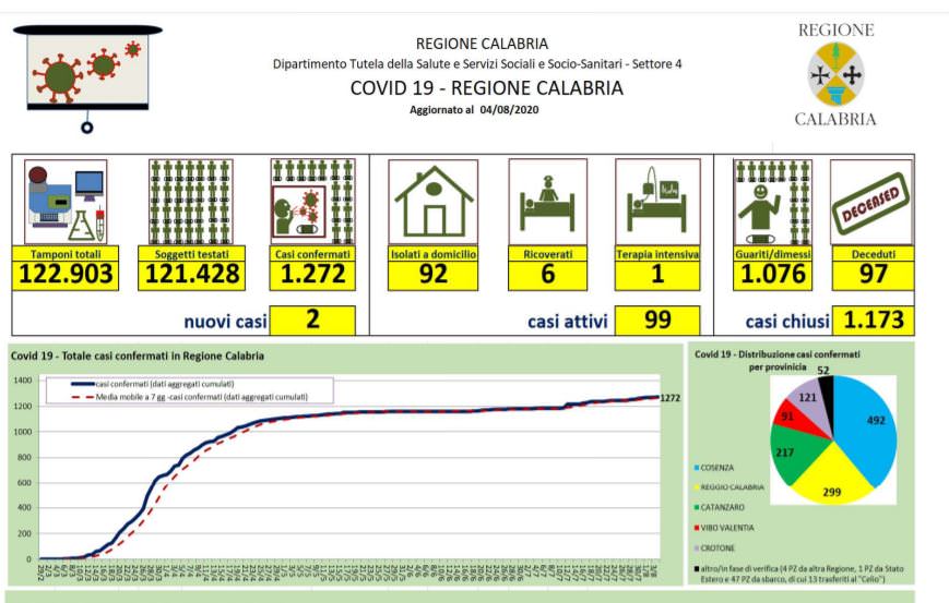 CATANZARO Due nuovi contagi in Calabria nelle ultime 24 ore. È quanto emerge dal bollettino del 4 agosto della Regione Calabria. Si tratta di un migrante ospite del Cara di Crotone e di un paziente finito al Grande ospedale metropolitano di Reggio. Così salgono ad oggi 1.272 (+2 rispetto a ieri) le persone risultate positive al Coronavirus. Mentre dall’inizio della pandemia sono risultati negativi sono 120.162 tamponi su 121.428 processati. Attualmente risultano positivo 99 persone di cui 7 ricoverati (uno in terapia intensiva per altra patologia).