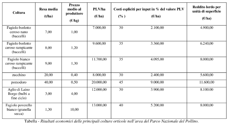 Dai dati ottenuti da una nostra indagine e riportati nella seguente tabella, si evince che le potenzialità remunerative delle principali colture praticate nell’area del Parco Nazionale del Pollino sono alquanto interessanti ed allettanti anche per i giovani. Come è noto, in queste aree, il produttore agricolo, oltre a svolgere la funzione di imprenditore, riveste anche il ruolo di proprietario fondiario che copre con il suo lavoro i fabbisogni dell’azienda. Pertanto, i costi espliciti sostenuti per un ciclo produttivo delle colture sono contenuti e variano, a seconda della specie, dal 30% al 45% del valore della produzione mentre il reddito lordo tende a coincidere con il reddito netto cioè a quanto l’operatore agricolo porta a casa dopo la vendita del prodotto, al netto delle spese per gli input esterni. Le tecniche di coltivazioni di queste specie orticole sono estremamente semplici, inoltre, permettono una organizzazione aziendale del lavoro concentrato in un periodo che non supera 5 mesi all’anno (da maggio a settembre). Per questo, la produzione orticola si rivela più allettante, per i giovani, anche per quanti non abbiano esperienza nel settore agricolo. Con questa consapevolezza, più recentemente abbiamo svolto dei seminari frequentati da giovani imprenditori e riguardanti gli ecotipi locali l’orticoltura tipica e di qualità del Pollino. Altro vantaggio economico di queste produzioni è che non richiedono grandi investimenti e non presentano, quindi, un rischio d’impresa elevato. I mercati di sbocco dei prodotti orticoli del Pollino sono principalmente locali con particolare riferimento alle zone balneari della Regione Calabria, frequentate d’estate da un gran numero di turisti. Ciò non toglie che parte del prodotto trovi collocazione in altri mercati calabresi e, anche se in misura minore, nelle Regioni vicine (Sicilia, Campania, Puglia).