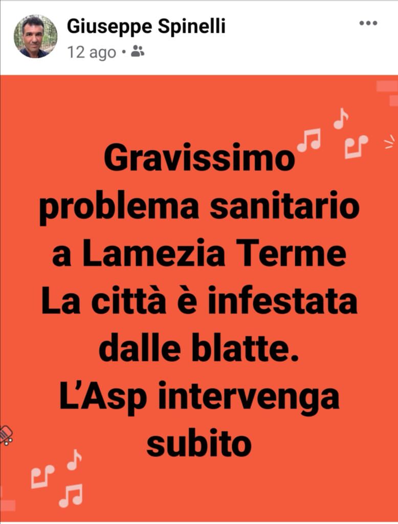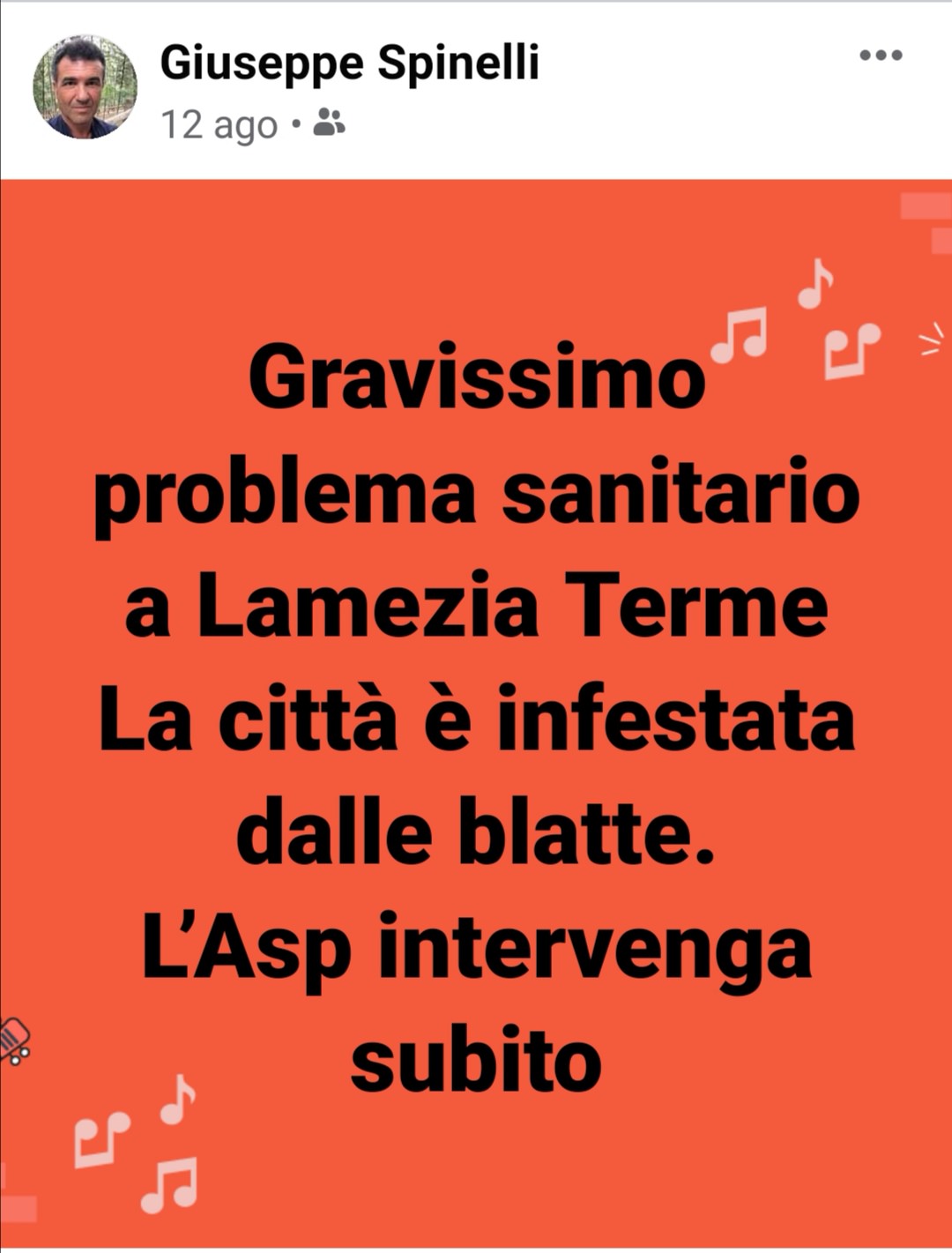 LAMEZIA TERME Una blatta in via Montelungo, leggiadramente adagiata sulla soglia di un portone. La foto è stata postata su Facebook da Giuseppe Spinelli, avvocato, cittadino di Lamezia Terme, per diversi anni coordinatore di Forza Italia Lamezia e, last but not least (ultimo, ma non per importanza) cognato del sindaco Paolo Mascaro. Già il 12 agosto scorso, l’avvocato Spinelli aveva postato l’allarmante frase: «Gravissimo problema sanitario a Lamezia Terme. La città è infestata dalle blatte. L’Asp intervenga subito». Cinque giorni dopo ecco postata la foto dell’animaletto in via Montelungo.