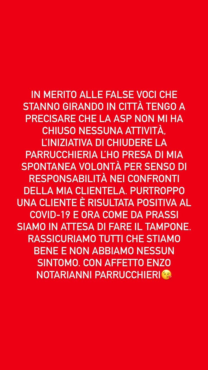 LAMEZIA TERME «Ho chiuso la parrucchieria di mia spontanea volontà e per senso di responsabilità nei confronti della mia clientela». Questa la decisione di Enzo Notiarianni, titolare dell’omonima attività commerciale a Lamezia Terme dopo che una cliente, nei giorni scorsi, è risultata positiva al Covid-19.