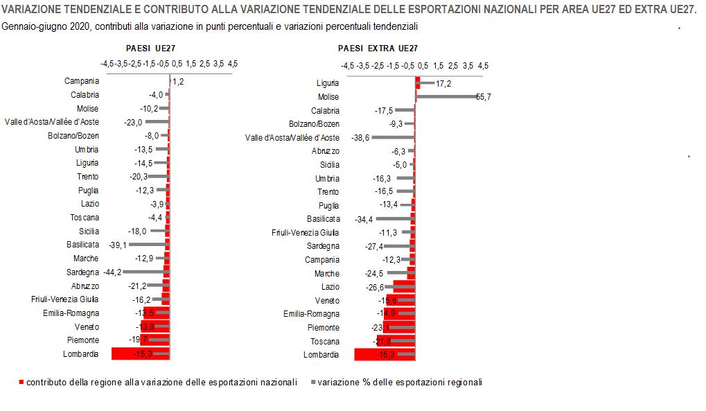 In termini assoluti in questo semestre la Calabria ha perso – rispetto allo stesso periodo dello scorso anno – 27 milioni di euro passando dunque da 228 milioni di euro del primo semestre del 2019 a 201 di quest’anno. Un valore che comunque pone appunto la regione come quella con minore peso specifico tra le regioni italiane molto al di sotto ad esempio di territori decisamente più piccoli come la Basilicata (1,191 miliardi di euro il valore delle esportazioni nel 2020 per questa regione)