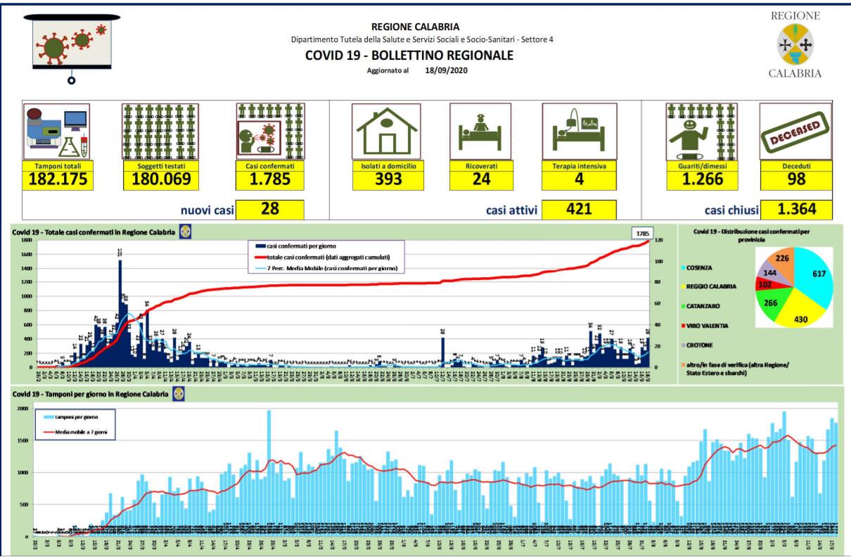 CATANZARO Ventotto nuovi casi di coronavirus nelle ultime 24 ore. Cresce così la curva dei contagi registrati in un giorno nella regione. Che fa salire così a 1.785 (+28 rispetto a ieri) il numero delle persone risultate infette dall’inizio della Pandemia. Fino ad oggi in Calabria sono stati effettuati 180.069 tamponi di cui 178.284 sono risultati negativi. Attualmente risultano attivi 421 casi di cui 28 ricoverati in ospedale. Sale anche il numero dei pazienti che si trovano tra i ricoverati in terapia intensiva: con oggi 4.