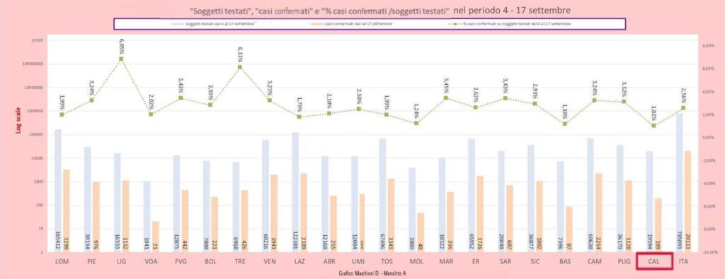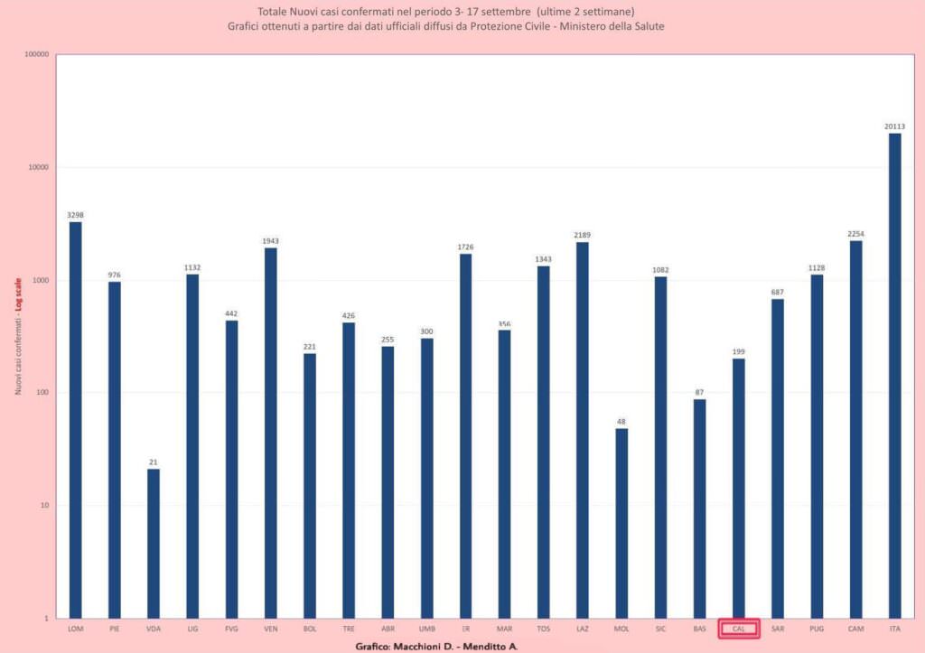 IL MONITORAGGIO Intanto continua il monitoraggio sull’incidenza del virus in Calabria. In regione, tra il 3 e il 17 settembre si sono registrati 199 casi su un totale di 20.113 in Italia. La Calabria è al quart’ultimo posto tra le regioni per numero di nuovi positivi, lontanissima da cifre come quelle della Lombardia (3.298 positivi), della Campania (2.254) e del Lazio (2.189). Buone notizie anche da un’altra statistica avanzata sui contagi registrati. In questo caso la Calabria è ultima per totale dei nuovi casi confermati per 100mila abitanti nelle due settimane prese in esame. L’indice è pari a 10,22. Fanno peggio anche Basilicata (15,46) e Molise (15,71). I valori più alti si registrano nella Provincia di Trento (79,15), in Liguria (73) e nella Provincia di Bolzano (42,43). Altro ultimo posto (cioè altra buona notizia) anche per la percentuale di casi confermati su soggetti testati (il periodo di riferimento è 4-17 settembre). Per la Calabria è pari all’1,02%, La Basilicata è all’1,18%, il Molise all’1,24%. I dati più alti in Liguria (6,85%), a Trento (6,11%) e nelle Marche (3.45%).