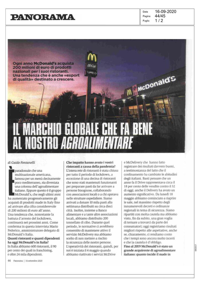 «È paradossale – così esordisce l’approfondimento a firma di Guido Fontanelli – che una multinazionale americana, famosa per un menù decisamente poco mediterraneo, sia diventata una colonna dell’agroalimentare italiano. Eppure – prosegue – questo è il gruppo McDonald’s, che negli ultimi anni ha aumentato progressivamente gli acquisti Made in Italy fino ad arrivare alla cifra considerevole di 200 milioni di euro all’anno. Una tendenza che, nonostante la battuta di arresto del lockdown, continuerà nei prossimi anni».