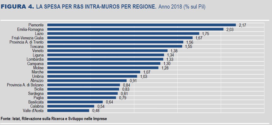 Non per nulla l’innovazione rappresenta uno dei pilastri su cui si basa anche l’ossatura delle linee guida del Piano nazionale di ripresa e resilienza per accedere alle risorse del Recovery Fund. Sempre stando al report dell’Istat è emerso che sono state le imprese del Nord a trainare la spesa in R&S visto che rappresentano, con 15,9 miliardi di euro, ben il 63,1% dell’intera fetta di investimenti effettuati in Italia nel settore. Anche se per effetto del Covid, l’Istat prevede una flessione degli investimenti per il 2020 di quasi 5 punti percentuali in Italia. Ma resta il dato elevato di risorse impegnate dalle piccole e medie imprese concentrate in cinque regioni: Lombardia, Lazio, Emilia Romagna, Piemonte e Veneto.