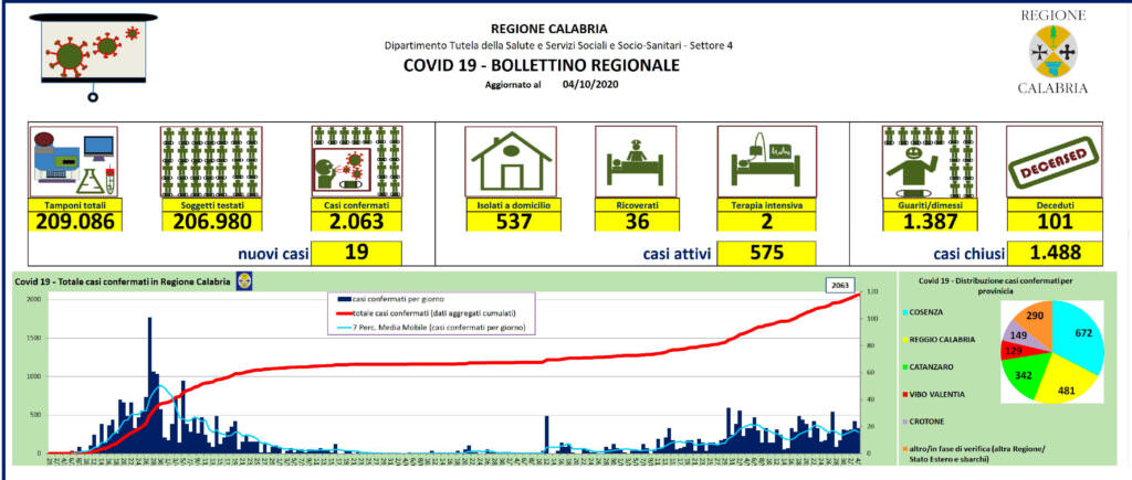 LA SITUAZIONE AD OGGI IN CALABRIA In totale dall’inizio della pandemia sono stati effettuati 209.086 tamponi su 206.980 soggetti, i 2.063 di differenza sono i tamponi ripetuti ai positivi già noti per i quali si doveva verificare se nel frattempo si fossero negativizzati. Attualmente sono attivi 575 casi, ovvero i positivi in Calabria, dei quali solo 38 sono ricoverati in ospedale, 36 in malattie infettive e 2 in terapia intensiva, mentre 537 sono in isolamento domiciliare.