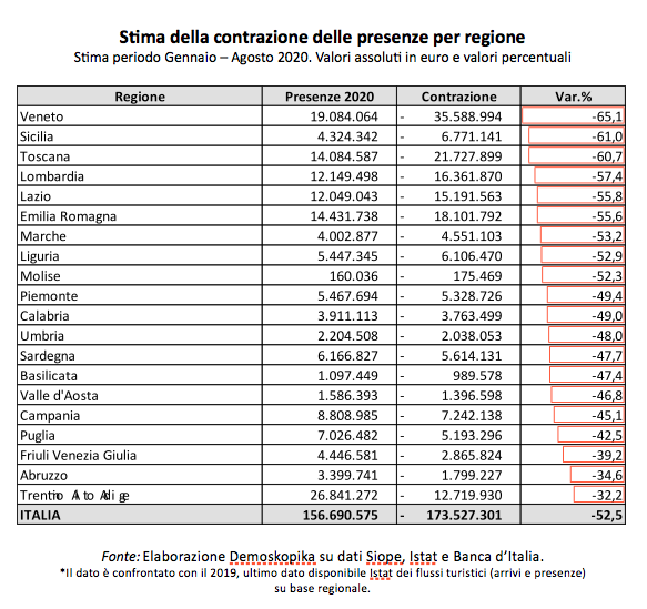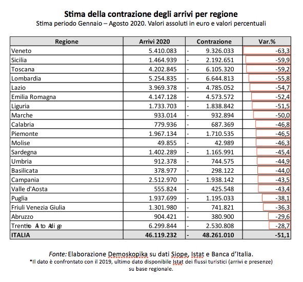 La contrazione del consumo totale di beni e servizi da parte del viaggiatore (alloggio, pasti, intrattenimenti, souvenir, regali, altri articoli per uso personale ecc.) si sarebbe avvertita, in maniera significativa, anche in altre cinque destinazioni regionali: Campania con 710 milioni di euro, Liguria con 668 milioni di euro, Sicilia con 539 milioni di euro, Piemonte con 469 milioni di euro e Sardegna con 468 milioni di euro. Al di sotto della “soglia psicologica” dei 400 milioni di euro si posizionano i rimanenti sistemi turistici regionali: Marche con 349 milioni di euro, Puglia con 338 milioni di euro, Marche con 349 milioni di euro, Friuli Venezia Giulia con 275 milioni di euro, Calabria con 258 milioni di euro, Umbria con 159 milioni di euro, Valle d’Aosta con 135 milioni di euro, Abruzzo con 128 milioni di euro, Basilicata con 79 milioni di euro e, infine, Molise con 11 milioni di euro.