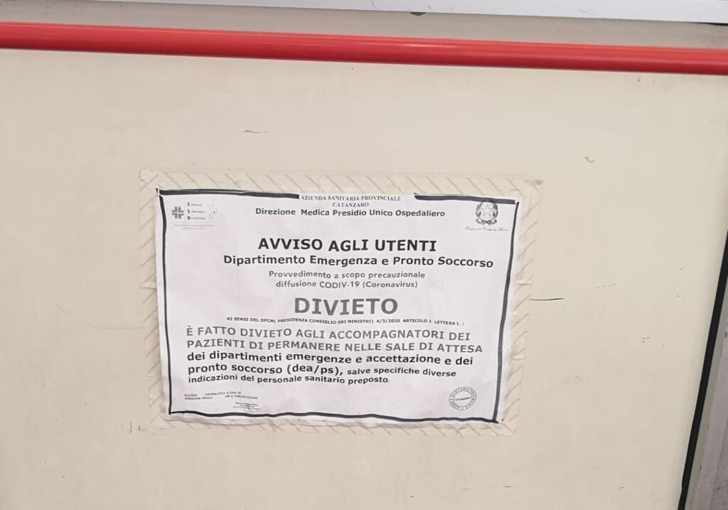 INCIVILTÀ In questa bolgia si aggiunge il concorso di colpa dell’inciviltà. Un cartello posto all’ingresso del Pronto soccorso lo dice chiaramente: «È fatto divieto agli accompagnatori dei pazienti di permanere nelle sale d’attesa». Parole al vento e guai a farlo notare: si rischiano discussioni infinite e tensioni. Così alla paura collettiva, dettata dall’aumento esponenziale dei contagi anche nel comprensorio lametino, si aggiunge il suo contrario: il menefreghismo, il mancato riconoscimento di un pericolo reale e la necessità di un comportamento responsabile.