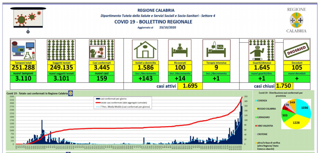 I casi confermati oggi sono così suddivisi: Cosenza: 38 Catanzaro 14 Crotone 3 Vibo Valentia 0 Reggio Calabria 104 Altra Regione o stato Estero 0.