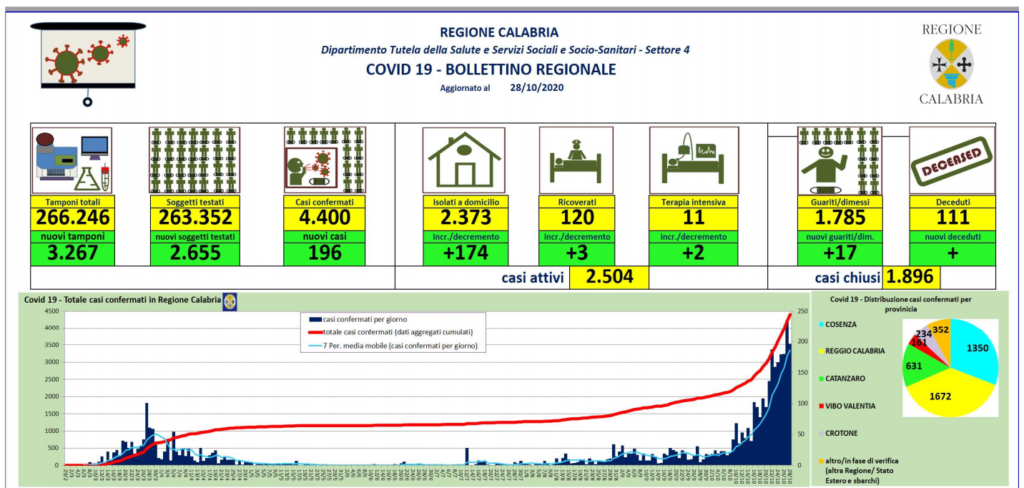 – Catanzaro: CASI ATTIVI 298 (28 in reparto; 2 in terapia intensiva; 268 in isolamento domiciliare); CASI CHIUSI 337 (301 guariti, 36 deceduti).