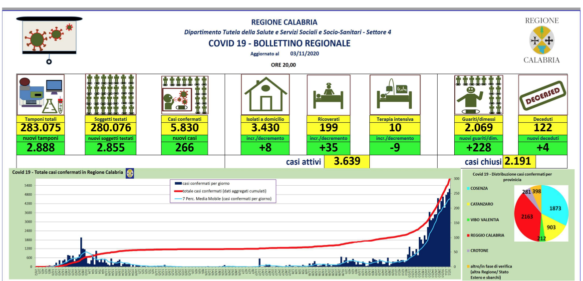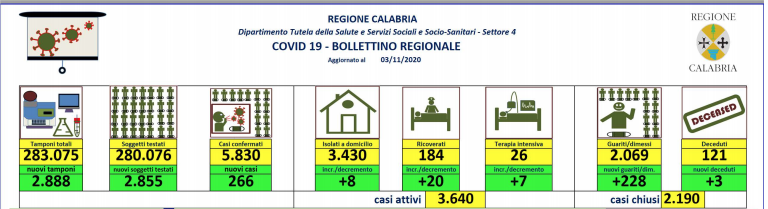 – Reggio Calabria: CASI ATTIVI 1.402 (68 in reparto; 2 in terapia intensiva; 1.332 in isolamento domiciliare); CASI CHIUSI 762 (736 guariti, 26 deceduti).
