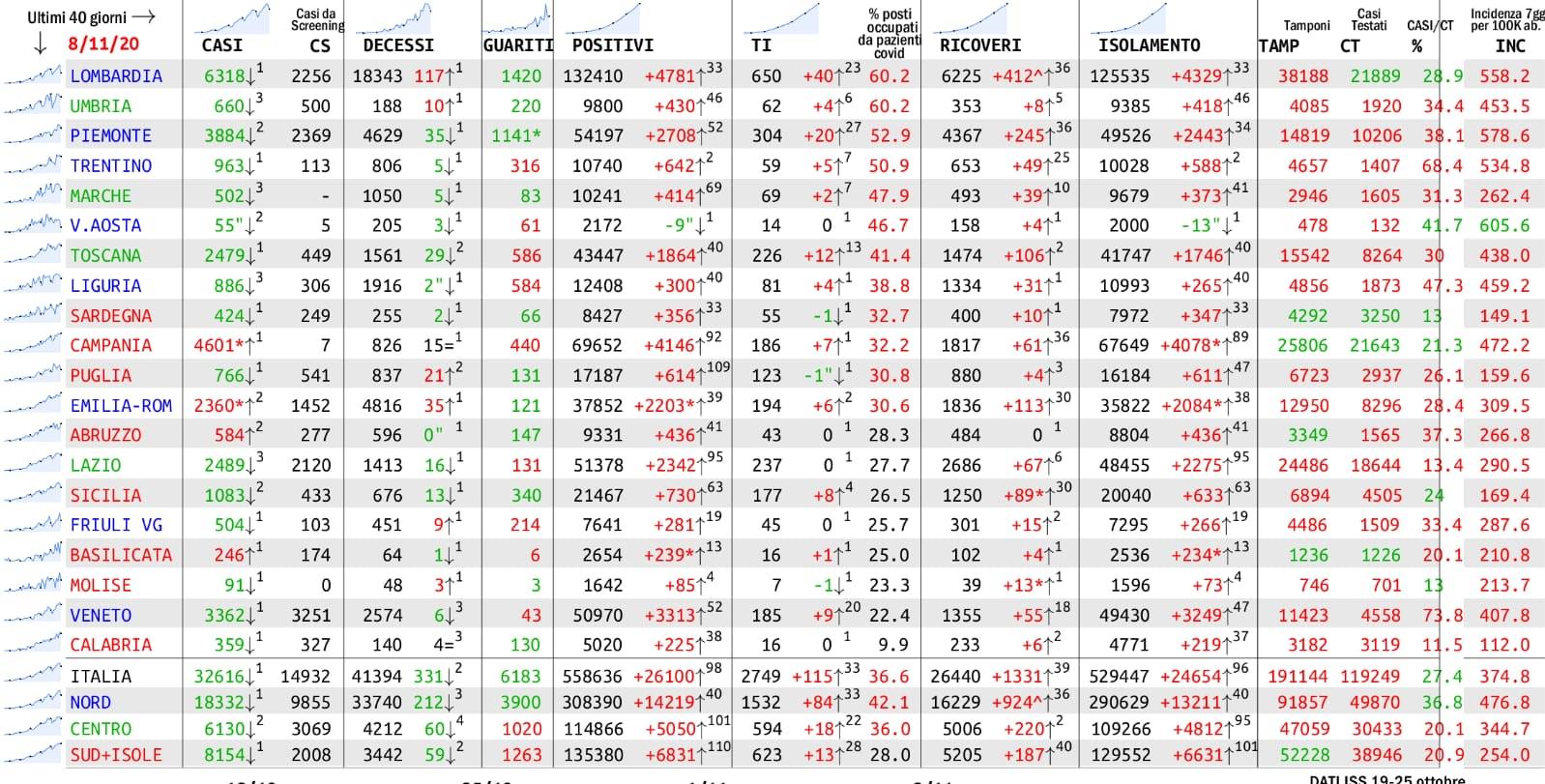 Numeri ancora oltre la media nella regione “zona rossa”. Il numero totale dei positivi arriva ora a 7.465 mentre i tamponi effettuati sono stati 3.182
