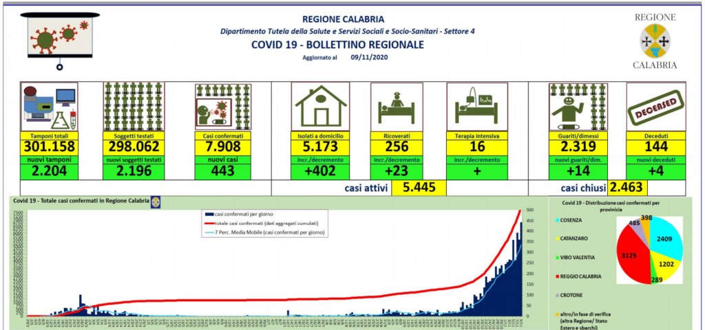 – Catanzaro: CASI ATTIVI 817 (60 in reparto; 8 in terapia intensiva; 749 in isolamento domiciliare); CASI CHIUSI 389 (347 guariti, 42 deceduti).