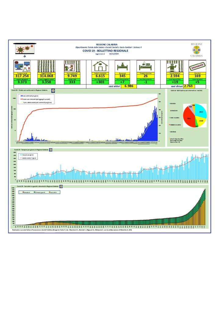 – Reggio Calabria: CASI ATTIVI 2.849 (119 in reparto; 10 in terapia intensiva; 2.720 in isolamento domiciliare); CASI CHIUSI 1.112 (1.070 guariti, 42 deceduti).