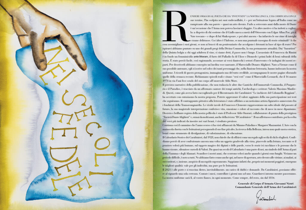 Per il Calendario Storico del 2021, l’Arma dei Carabinieri si è affidata alla penna di Valerio Massimo Manfredi, cantore e custode della storia antica, e alle tavole realizzate da un esponente della Transavanguardia italiana, Francesco Clemente.