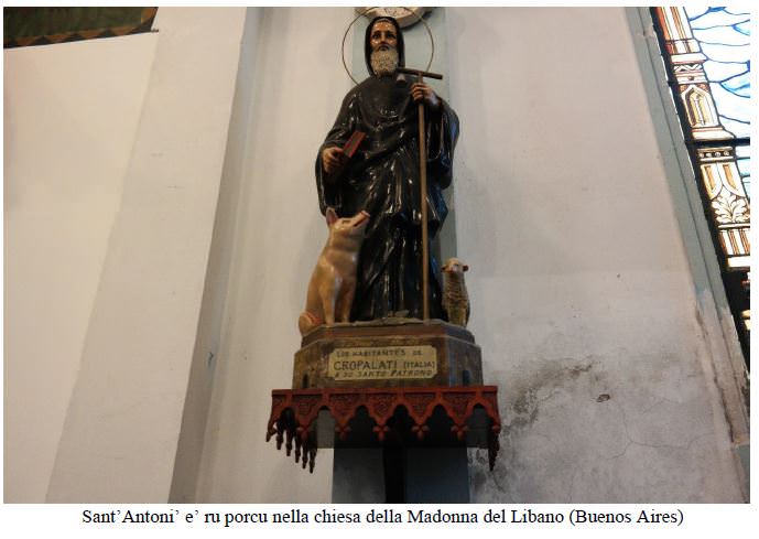 Spostandosi in Argentina, sembra di imbattersi nella storia di don Camillo e Peppone in salsa calabro-americana. Negli anni Sessanta, la comunità cropalatese a Buenos Aires era molto numerosa: a fronte del comune d’origine che vantava 2 mila abitanti, 600 erano i cropalatesi che vivevano in Argentina. Questi ultimi avevano formato un’associazione intitolata al Santo patrono. Tutti gli anni, il 17 gennaio, nel quartiere di San Martin, festeggiavano la festa del Santo, in contemporanea con il borgo d’origine, distante migliaia di chilometri. Da segnalare che, mentre a Cropalati è inverno, in Argentina è il periodo più caldo dell’anno: eppure, nonostante le temperature elevatissime, i devoti ripropongono le stesse tradizioni, la processione con la statua del Santo, le stesse ricette che impongono carne di maiale. All’interno del Comitato che organizza la festa si ripropone stessa la lotta fra destra e sinistra che occupava la scena italiana. Accade così che una delle due fazioni (maggioranza nel comitato) vota il trasferimento della festa e del Santo in un altro quartiere: villa Lugano. L’altra parte non accetta la decisione, si scinde, si porta la statua del Santo a casa. Allora, la parte che avevano votato per il trasferimento della sede in un altro quartiere fa arrivare un’altra statua dall’Italia e così, per qualche anno, il 17 gennaio, a Buenos Aires, la comunità di Cropalati celebrava due feste, con due Santi e due processioni diverse, che, unite a quella del paese d’origine fanno tre. Storie doppie, triple, di paesi che si sdoppiano e si rincorrono, al di là e al di qua dell’oceano.