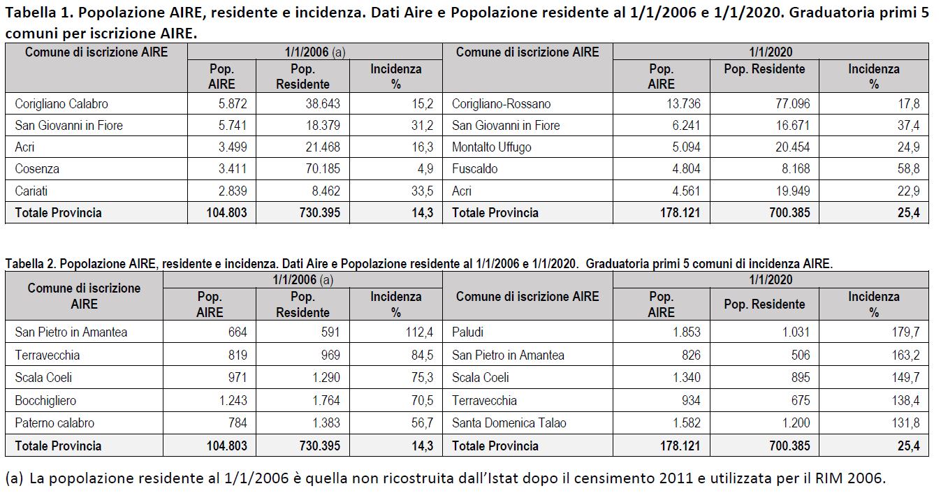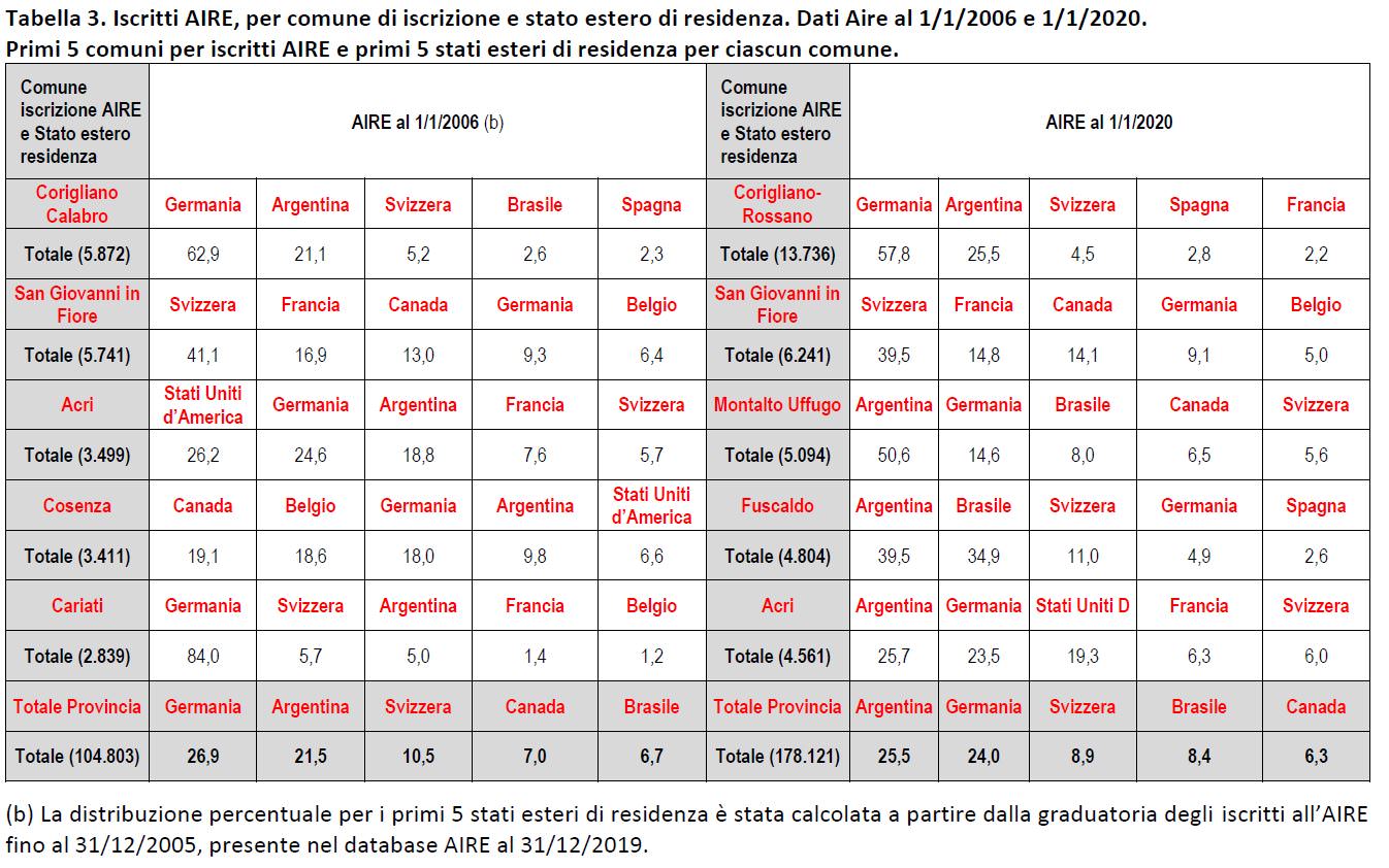 Le fasce di età con più iscritti sono quelle in età produttiva (19-40 e 41-65), anche se nel corso degli anni sono cresciuti gli over 65 anni. Rispetto ai dati regionali e a quelli delle altre province, la provincia di Cosenza recita sempre il ruolo di protagonista assoluto. Infatti, i cosentini prevalgono nettamente sulle altre province anche per numero di iscritti AIRE. I Paesi che registrano più iscrizioni all’AIRE sono innanzitutto Germania e Argentina, seguite a distanza da Svizzera, Brasile e Canada. Negli ultimi 20 anni, è cresciuta notevolmente anche la popolazione straniera: al 31 dicembre 2019, gli stranieri residenti in provincia di Cosenza sono 37.314 e rappresentano il 5,3% della popolazione (nel 2010, erano circa 10 mila; all’inizio del secolo 2 mila). La comunità straniera più numerosa è quella proveniente dalla Romania con il 39,2% di tutti gli stranieri presenti sul territorio, seguita dal Marocco (9,4%) e dalla Bulgaria (6,1%). Giova ricordare che, grazie ai nuovi arrivi alcuni borghi in via d’abbandono hanno trovato nuova vita (si veda il caso di Acquaformosa). Eppure, nonostante il crescendo di arrivi, il saldo migratorio totale è sempre negativo.