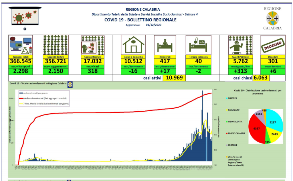 – Catanzaro: CASI ATTIVI 1.605 (72 in reparto; 13 in terapia intensiva; 1.520 in isolamento domiciliare); CASI CHIUSI 845 (781 guariti, 64 deceduti).