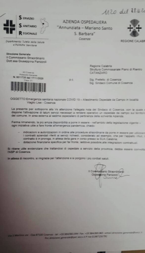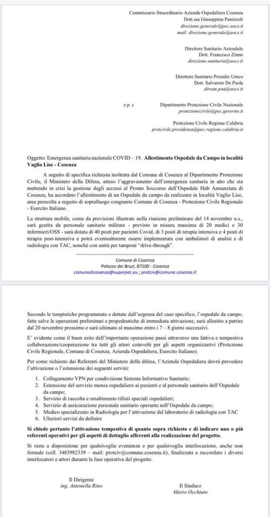 «Il Comune di Cosenza – rivela il primo cittadino – dopo aver richiesto l’allestimento dell’Ospedale da campo, in pochissimi giorni aveva individuato l’area e bonificato il sito realizzando tutti i lavori necessari per gli allacci delle reti. Inoltre ha immediatamente effettuato tutte le procedure necessarie per ospitare le oltre 80 persone giunte in città per il montaggio e la gestione del campo. Il tutto subito e senza richiedere nessuna Ordinanza regionale, ma con le procedure previste dalla legge che consentono il rimborso delle somme spese per l’emergenza Covid».
