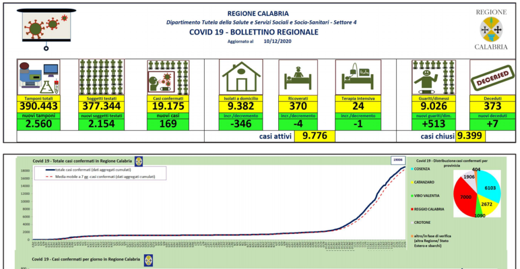 Covid, in Calabria altri 169 positivi. 7 i decessi – GRAFICO