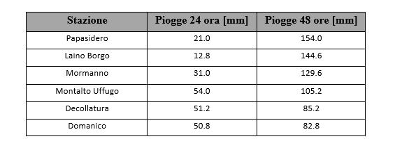 Nella tabella che segue si riportano i valori di pioggia maggiormente significativi.